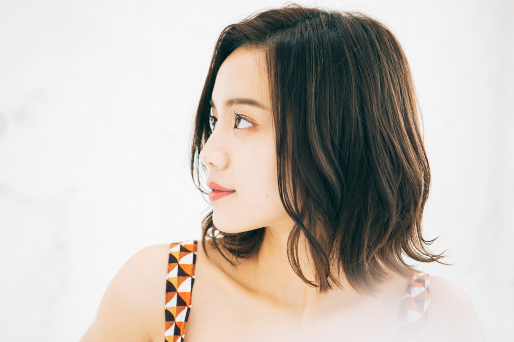 ディープラインの髪色と前髪をつくらないことで、クールに大人っぽく仕上げています。