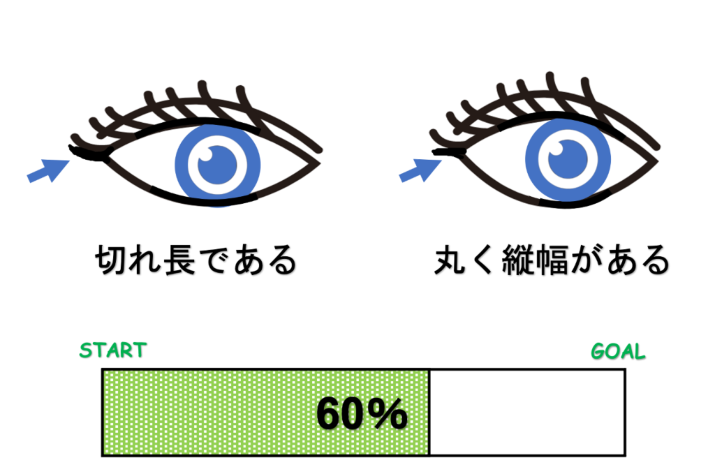 目の形に関しては明確な基準はありません。ご自身が意識している方を選択してください。というのも、表情やメイクしだいでどちらにでも寄せていけるからです。それでも迷った場合は、目尻のアイラインを跳ね上げていつも書いている人は、切れ長を選んで下さい。